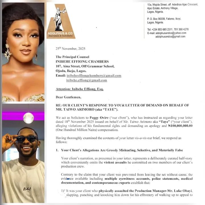 In a response issued by Adolphus & Co, Peggy’s legal team said Taiye’s claims were “misleading, selective and materially false,” insisting the actor is twisting the entire incident.