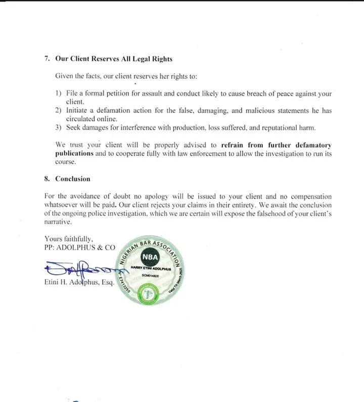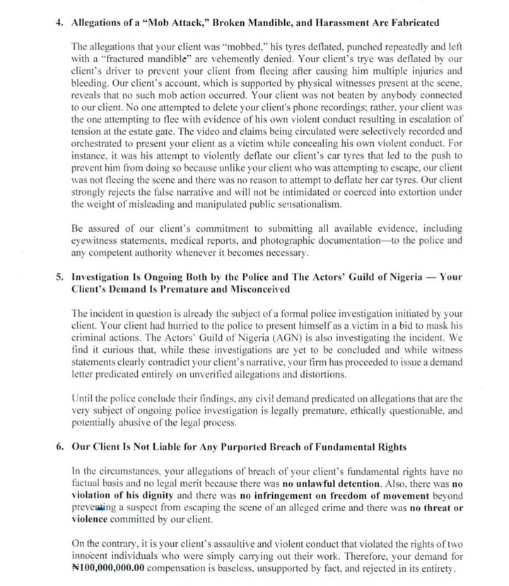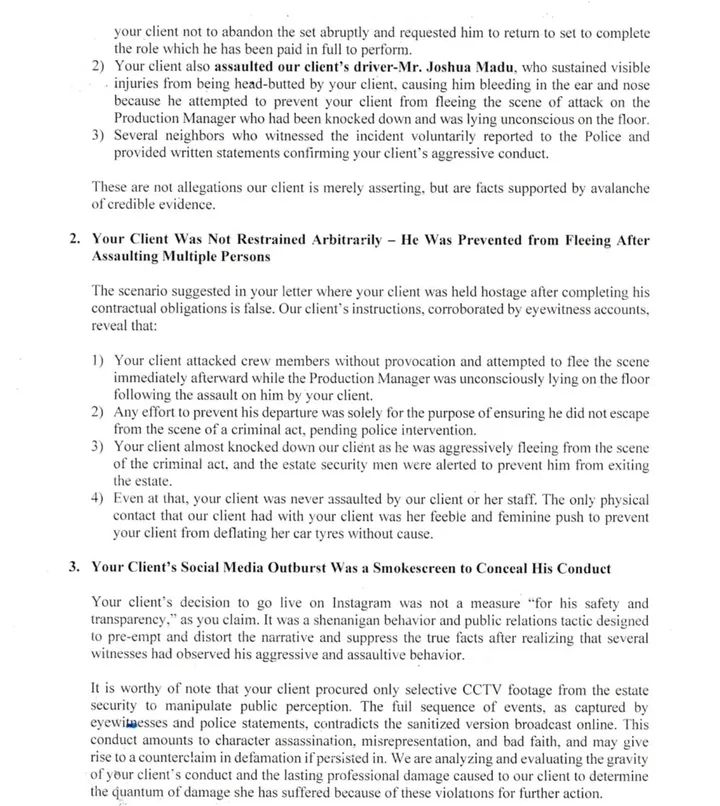 According to the letter, the issue started when Taiye was asked to return to set, but instead allegedly got into a heated confrontation. The response states that he assaulted the Production Manager, Luke Obayi, before allegedly head-butting Peggy’s driver, Joshua Madu, leaving him bleeding from the ear and nose. Witnesses around the location reportedly gave statements to the police confirming Taiye’s aggressive behaviour.