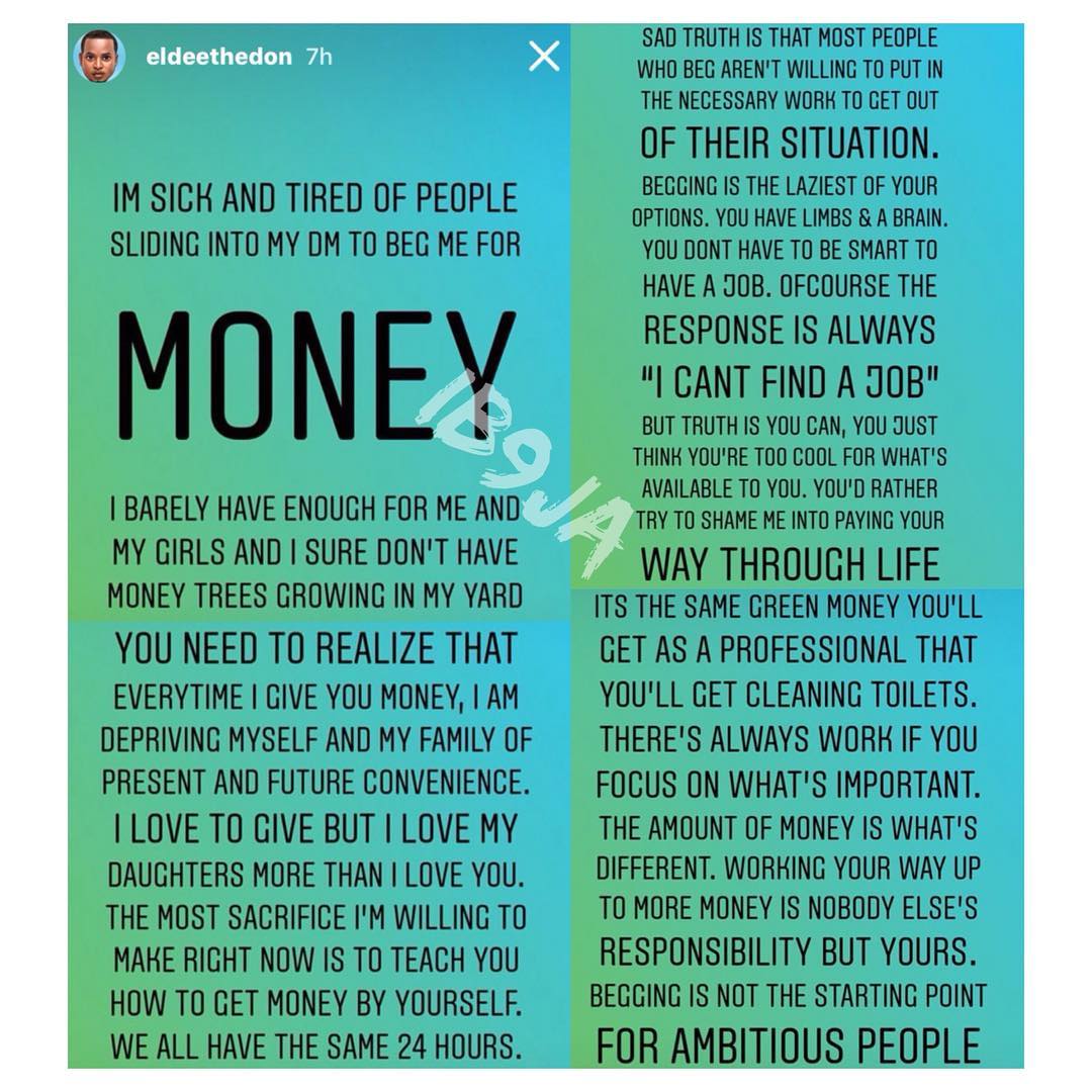 Eldee said, ‘ begging isn’t the starting point for ambitious people’ adding that, ‘I”m sick and tired of people sliding into my DM to beg me for money’.