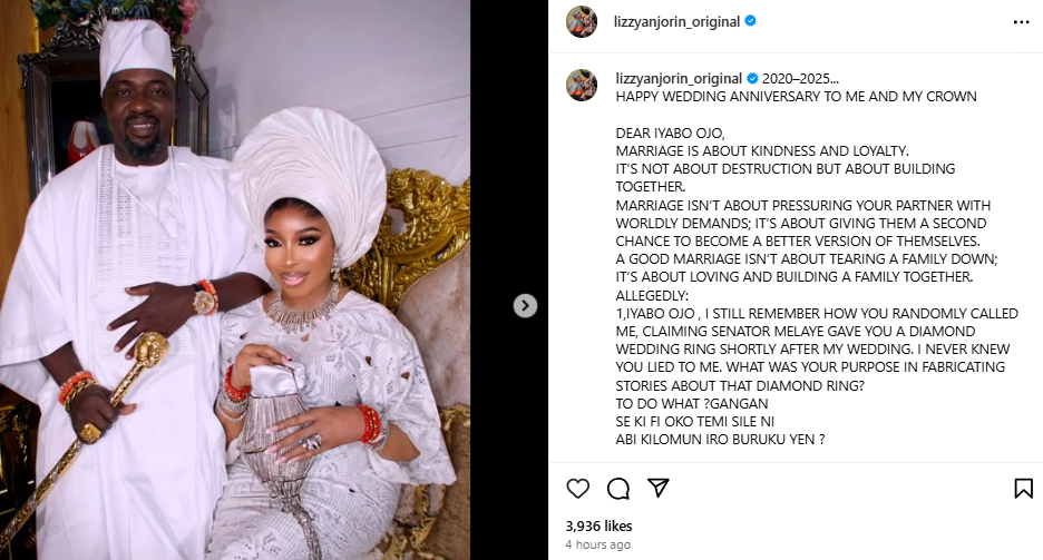 1,IYABO OJO , I STILL REMEMBER HOW YOU RANDOMLY CALLED ME, CLAIMING SENATOR MELAYE GAVE YOU A DIAMOND WEDDING RING SHORTLY AFTER MY WEDDING. I NEVER KNEW YOU LIED TO ME. WHAT WAS YOUR PURPOSE IN FABRICATING STORIES ABOUT THAT DIAMOND RING?