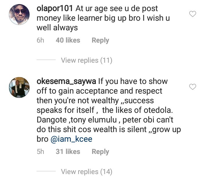 KCee posted wads of cash on Instagram following a sub from Soso Soberekon and Harrysong claiming that Five Star music label has fallen to One star.