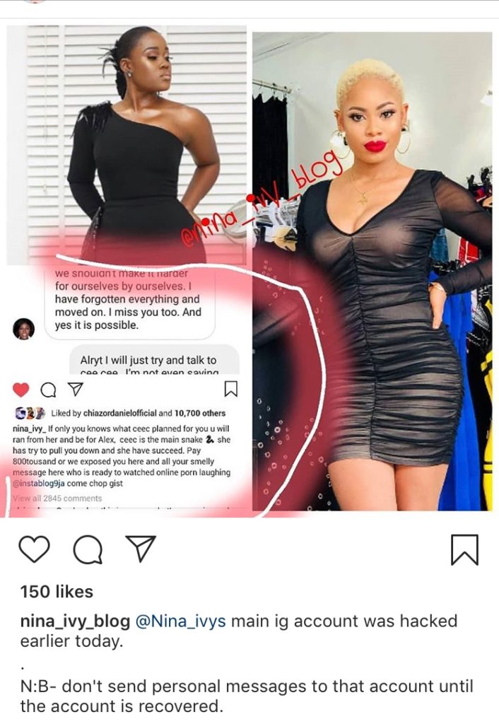 The Instagram account of Big Brother Naija Season 3 finalist, Nina has been hacked.